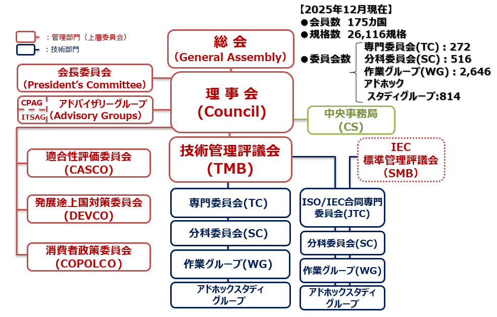 国際標準化機構(ISO)は、1947年に18ヶ国により、国家間の製品やサービスの交換を助けて標準化活動の発展を促進し、知的・科学的・技術的・経済的活動における国家間協力を発展させることを目的に発足した。 ISOは1ヶ国1機関のみが会員となることができ、各国におけるもっとも代表的な標準化機関が加入する。日本においては閣議了解に基づき1952年から日本産業標準調査会(JISC)が加入している。